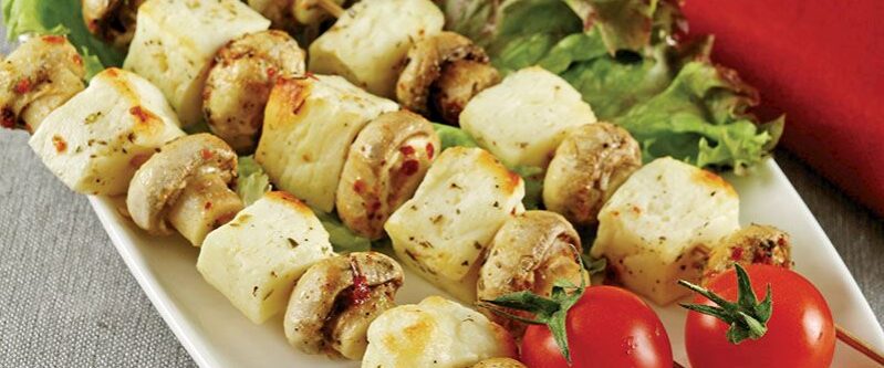 1.Derin bir kap içinde ezilmiş sarımsak, limon suyu, zeytinyağ ve baharatları karıştırın. 2.Üzerine mantarları ve iri küpler şeklinde doğranmış hellim peynirlerini ilave edip harmanlayın. 1-2 saat kadar marine ettikten sonra şişlere takın. 3.Fırınınızın ızgara bölümünde 6-7 dakika kadar pişirin. Sıcak servis edin. NOT:1 porsiyon hellim peynirli ve mantarlı şiş kebap 2 porsiyon ete denktir. Yanında kocaman yağsız bir mevsim salata ile yediğinizde hafif ama proteinli bir öğün tüketmiş olursunuz. Diyet yaparken et yemekten sıkıldıysanız size alternatif bir öğün olacaktır.